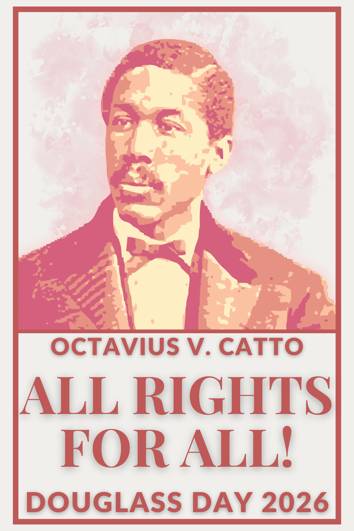 Poster in red, yellow, and orange with the text “All Rights for All” and “Douglass Day 2026” and a styled vintage portrait of Octavius V. Catto.