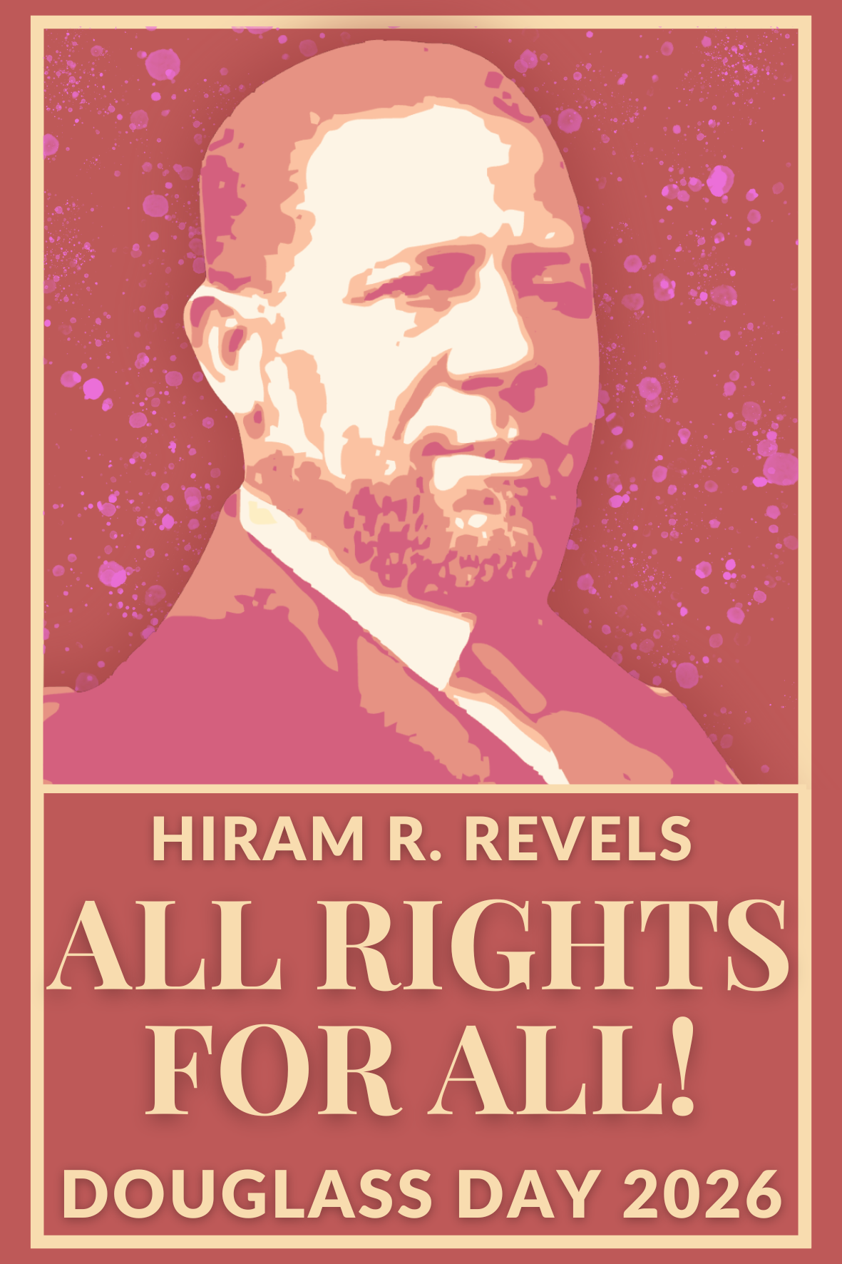 Poster in red, yellow, and orange with the text “All Rights for All” and “Douglass Day 2026” and a styled vintage portrait of Hiram R. Revels.