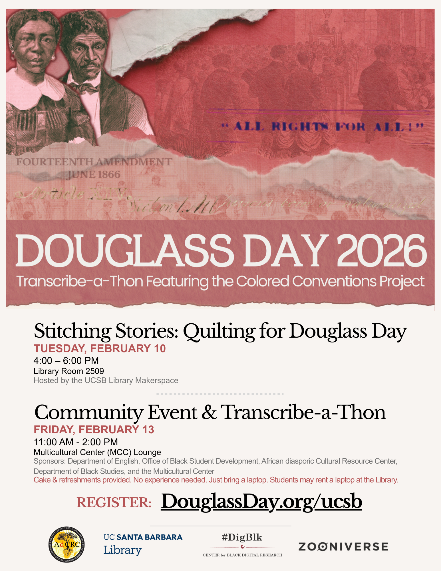 About: Douglass Day is a global transcribe-a-thon held every year to celebrate the chosen birthday of Frederick Douglass. Starting in 2026, Douglass Day will be newly and proudly housed at UCSB. Please join us for this collective action for Black history!